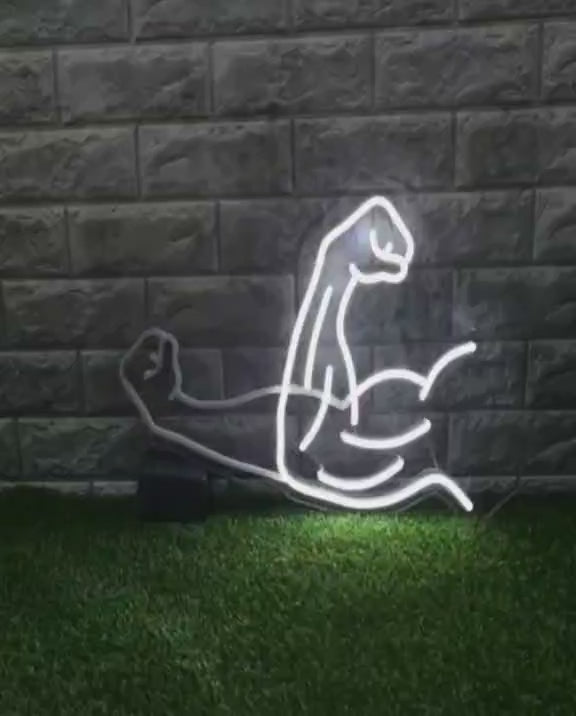 strength and discipline with this Muscle Power White Neon Sign. Designed as a bold outline of a flexed arm, this minimal yet powerful neon artwork represents hard work, consistency, and grind—perfect for gyms, home workout rooms, studios, or fitness brands.